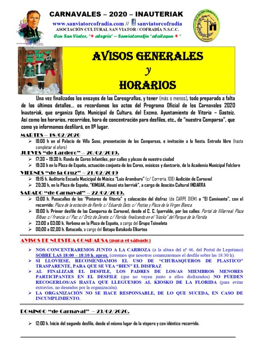 AVISO 11º – AVISOS GENERALES – HORARIOS y REORRIDOS (4)_page-0001 Published on 19/02/2020 in Carnavales 2020 InauteriakMáxima resolución (1241 × 1754) ← Anterior Siguiente →
